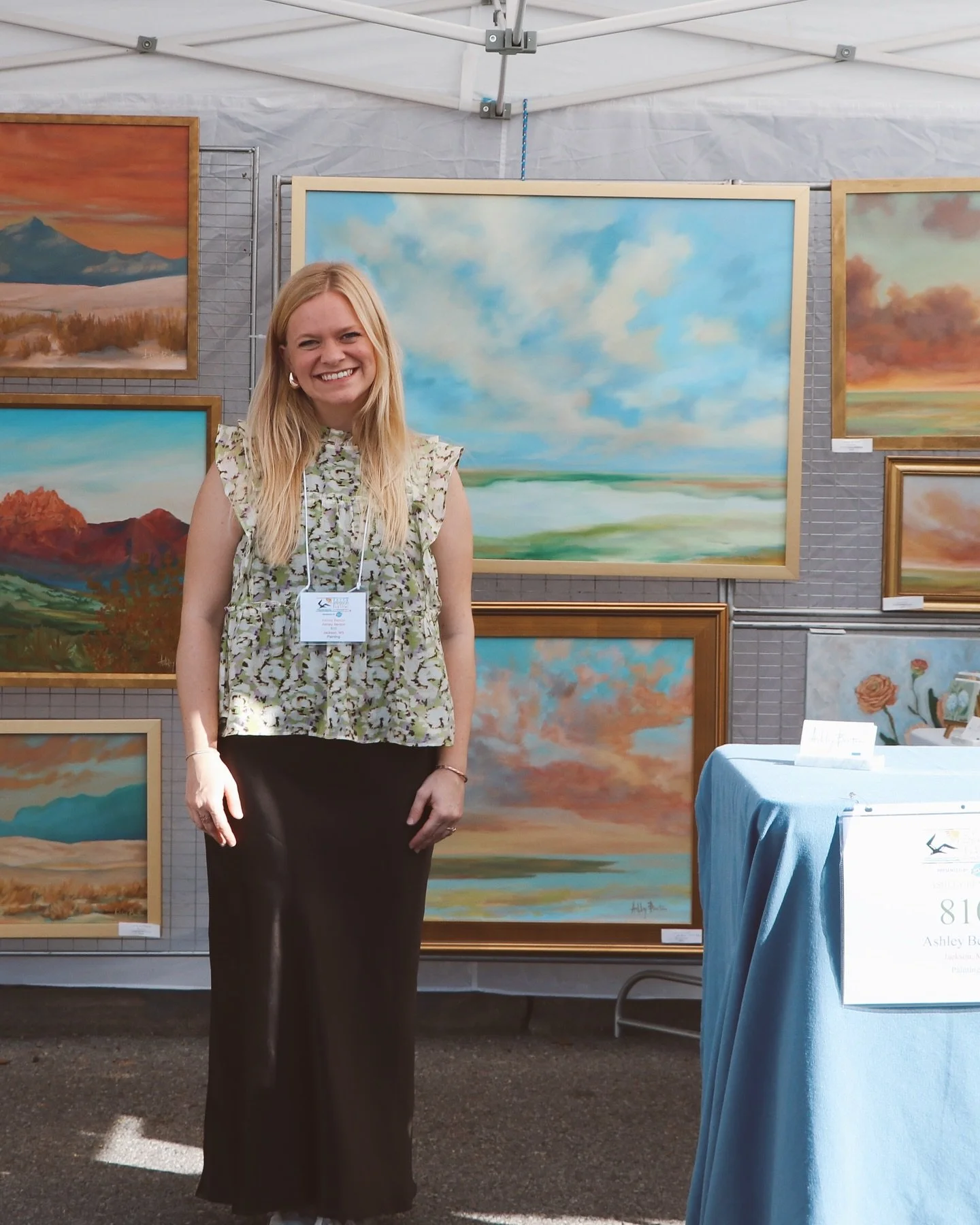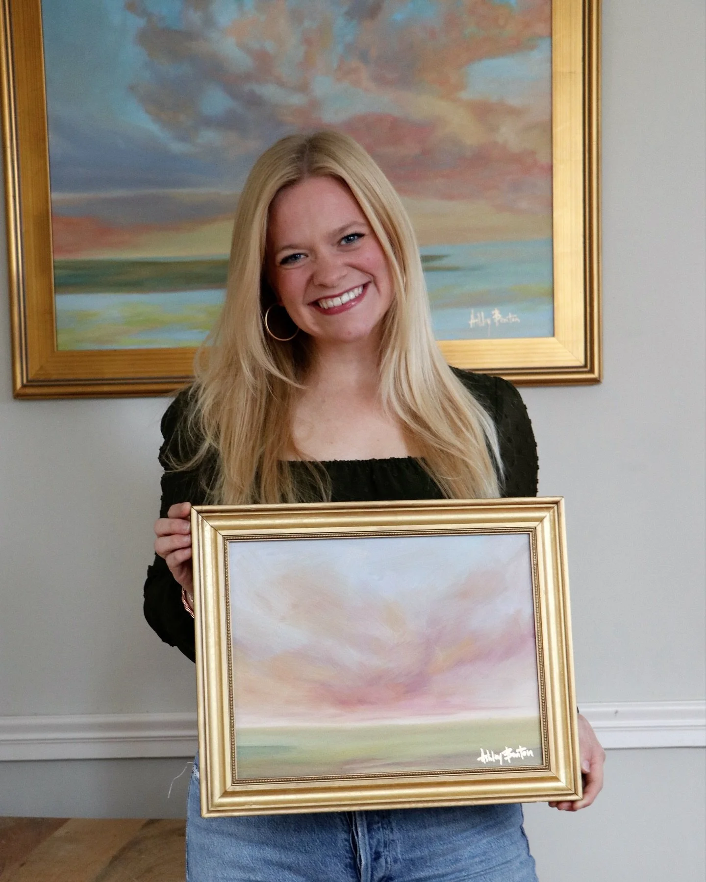Her landscapes capture a feeling of that particular place using vibrant colors and wispy brushstrokes often being described as soft, ethereal, and bright. To her, a vast landscape enhances her awareness of her small place in the world—that it is not the scenery that gets to partake in her life, but rather that she has the pleasure of partaking in something much greater than herself. Ashley paints in her backroom studio in Jackson, Mississippi. Her deepest desire as an artist is to bring people together through a shared sense of awe and reverence for the beautiful gifts of nature, time, and human love around us.